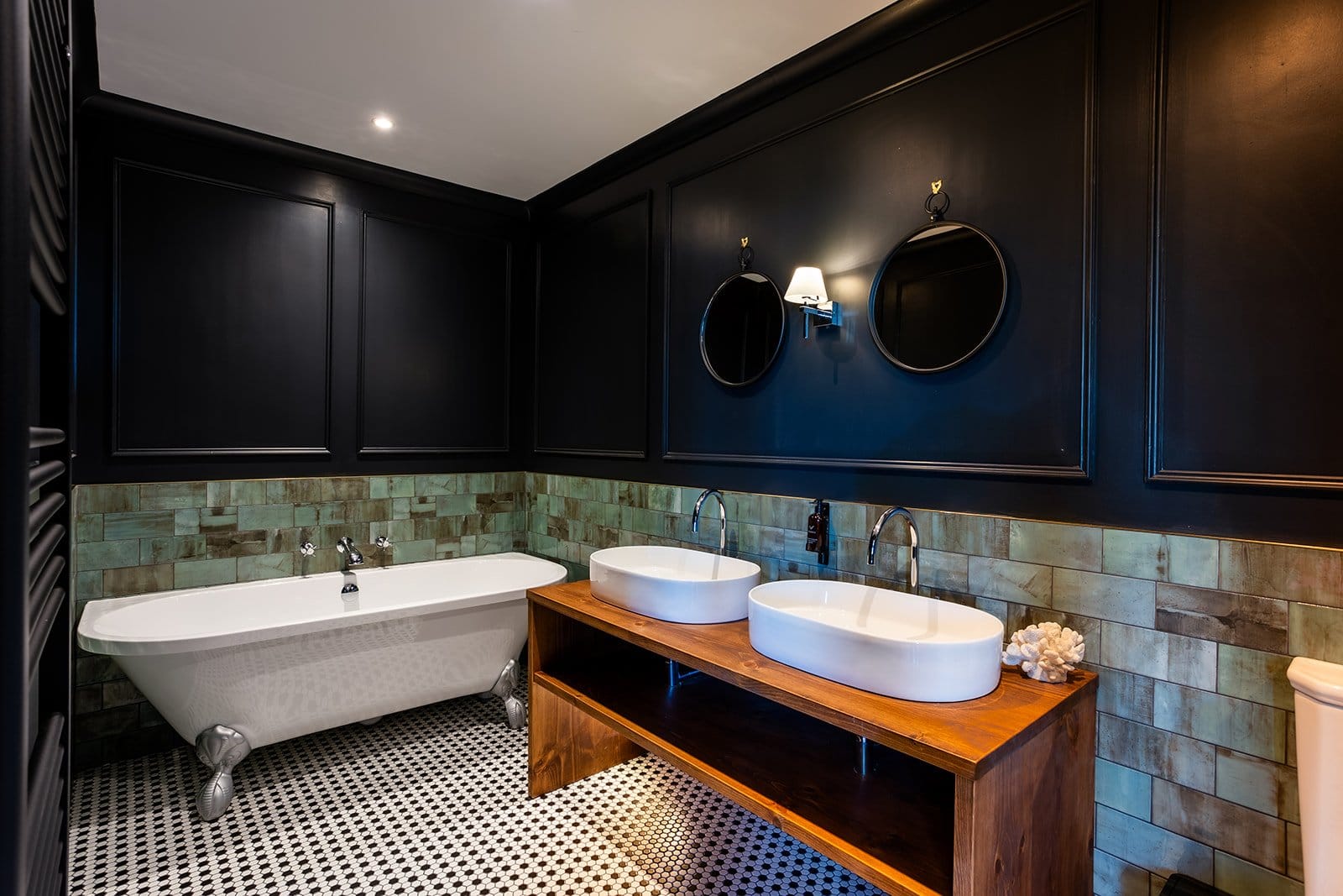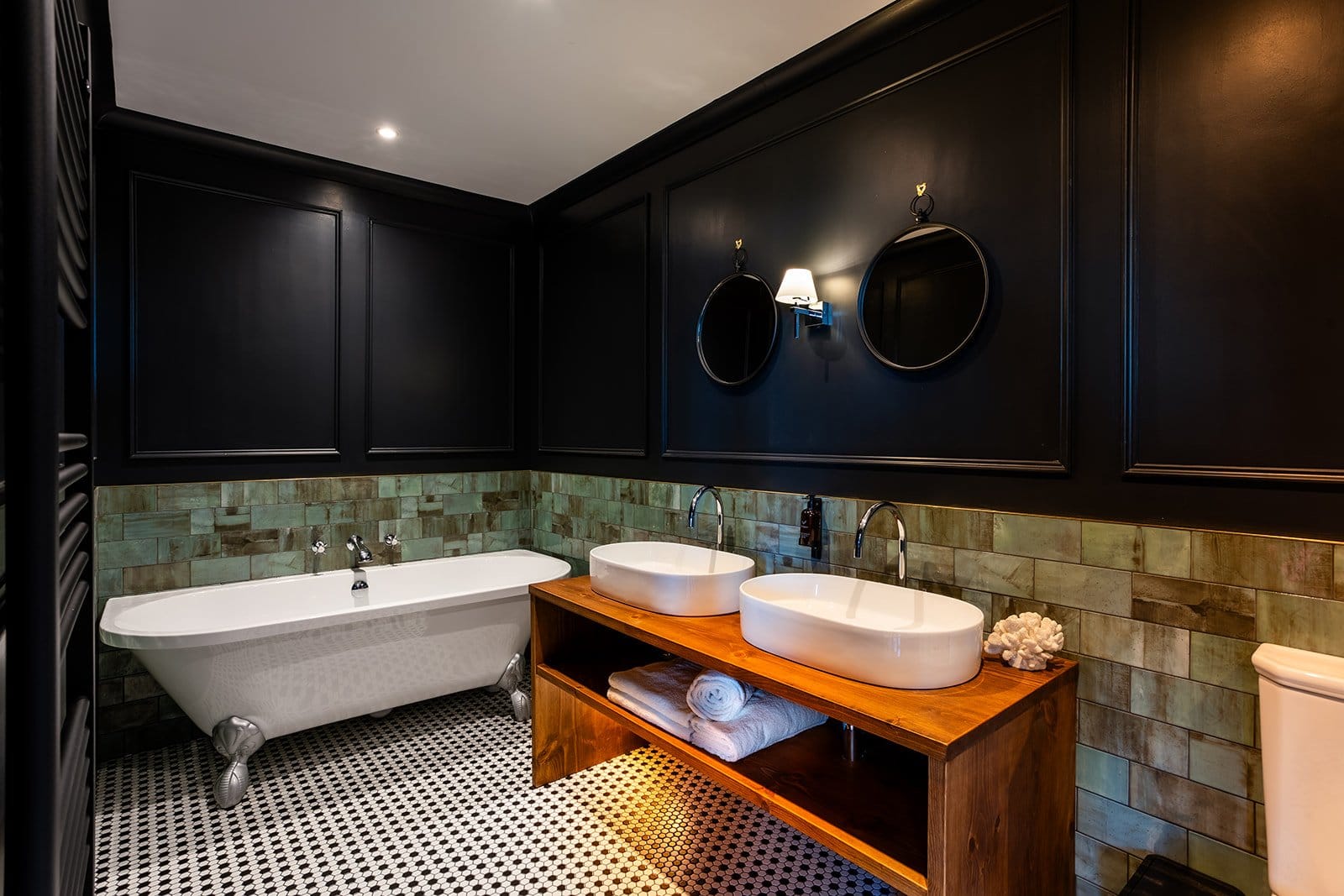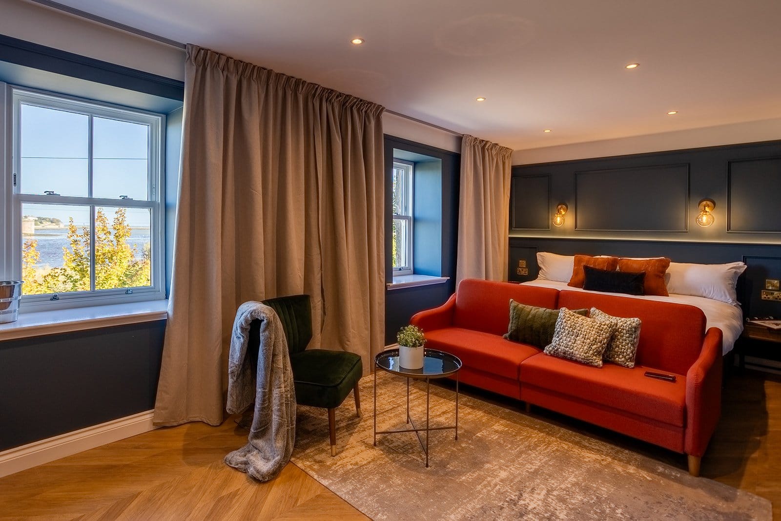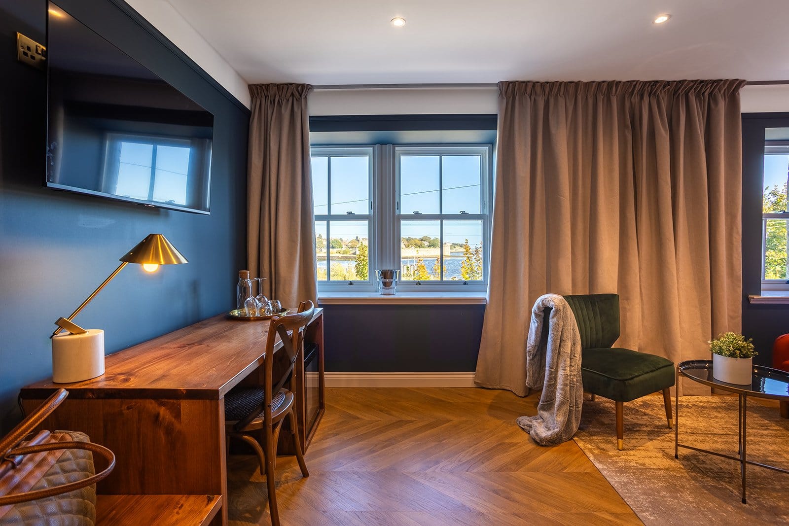Welcome to our elegant River View Suite. This suite features a super king-size bed and an inviting seating area. We have chosen deep blue hues and heritage-inspired furnishings to create a timeless atmosphere. The large windows showcase spectacular views of the River Tweed . Our River View Suite in Berwick upon Tweed offers an unforgettable experience.